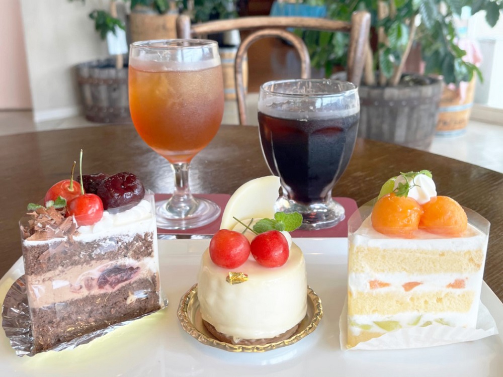 ショートケーキ・ロールケーキ・フルーツタルトの3種から。冷たいドリンクもOK!珈琲または紅茶からお選びください。